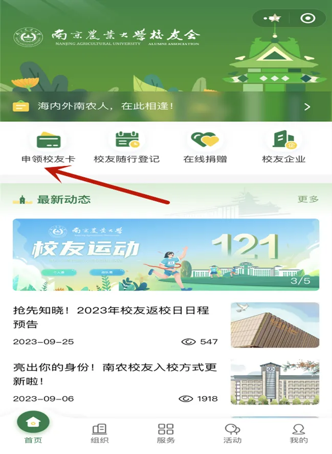 1.校友入校前,请进入微信小程序“南京农业大学校友会”,点击申领校友卡。因学校办学时间长,可能存在数据不全的情况,可上传毕业证、学位证等证明进行人工审核。