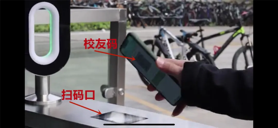 3.入校时,尽可能将手机屏幕调亮后,将身份码对准闸机的二维码模块处,扫码成功即可入校。