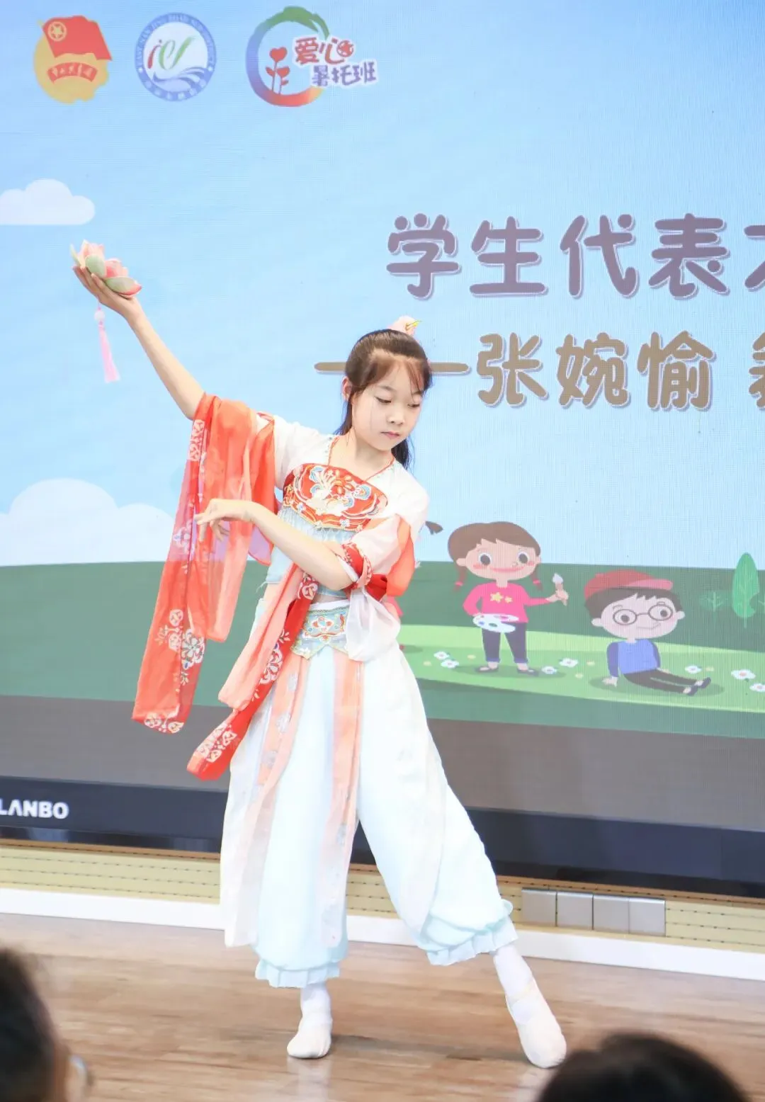 仪式开始,一段《南京东路街道爱心寒暑托班视频集锦》在大屏幕上播放,以光影串联起历年的温暖瞬间,这份穿越时光的记忆,既是对过往的生动总结,更为今年的暑托班埋下美好伏笔,班主任王功燃老师为学生们生动详实地介绍了今年暑托班的特色活动,从丰富多彩的活动设置到寓教于乐的动手实践,从贴心周到的服务安排到温暖有爱的班级氛围,同学们都兴奋地表示憧憬和期待,家长们也表示安心和放心。“老”学员代表张婉愉以一曲灵动的舞蹈《荷》尽显少年风采,赢得了现场阵阵热烈的掌声。