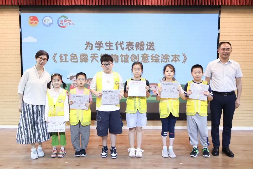 南京东路街道党工委副书记、办事处主任万明民和黄浦区委党史研究室二级调研员赵兵共同为学生代表赠送了《红色露天博物馆创意绘涂本》。这本绘涂本将红色文化与创意绘画相结合,孩子们可以在绘涂的过程中,接受革命传统熏陶,深入了解红色历史,让红色基因在心中生根发芽。