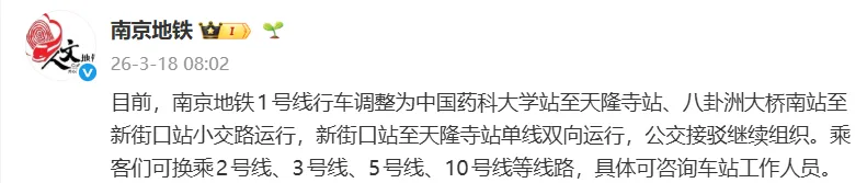 今早,南京地铁1号线新街口站至天隆寺站因设施设备故障临时停运。