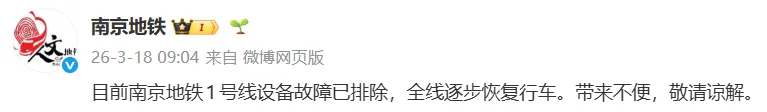 早上9点,南京地铁发布最新通知:目前南京地铁1号线设备故障已排除,全线逐步恢复行车。带来不便,敬请谅解。