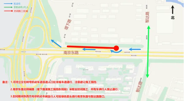 根据《中华人民共和国道路交通安全法》等相关法律法规规定,决定对南京东路北侧辅道与堤下路交会处周边区域实施封闭或临时占道施工,现将有关事项通告如下: