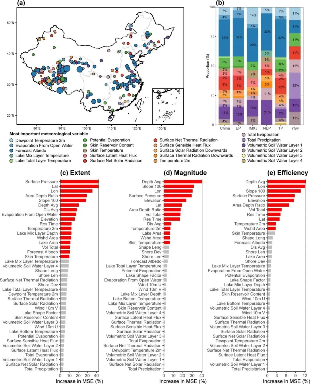 研究发现:我国湖泊对夏季白天最高气温有显著降温作用,湖泊降温效应平均影响范围为27.5公里,平均降温强度达1.03°C,平均降温效率为0.46°C/10公里。空间尺度上,云贵高原湖泊冷却效率最高,东北平原湖泊冷却效应最弱。演变趋势上,全国57%的湖泊降温效率呈显著增强趋势,但存在区域非对称性变化特征,其中青藏高原湖区冷却效率显著增强,而东部平原湖区则呈下降趋势。归因分析进一步揭示了湖泊降温效应的主要驱动因子,结果表明湖泊降温效应的区域非对称变化主要受湖泊表面反照率、湖泊水深及周边地形等因素的协同控制,其中,反照率主导湖泊降温效应的时间变化,而水深与地形则决定其不同湖泊降温效率的空间差异。本研究基于湖泊反照率与水深的耦合关系,构建了全国尺度的湖泊降温效应分类体系,为评估和预测湖泊气候调节功能提供了全新视角,也为理解与调控极端高温下的湖泊韧性提供了关键科学支撑。