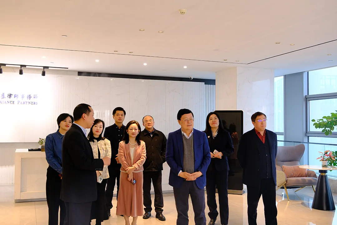 朱联海陪同来宾参观了律所办公环境与文化建设阵地,详细介绍了泰州分所的发展历程、党建特色与业务布局,使来访嘉宾切身感受到泰州分所的专业氛围与发展理念。