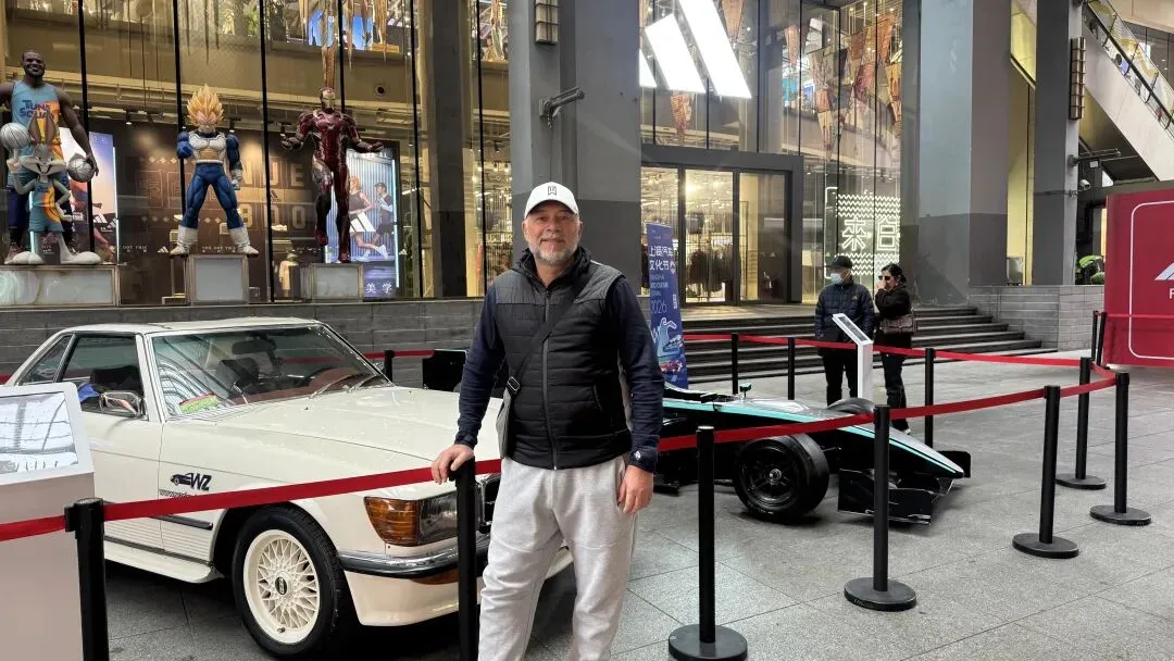 人群中, 一位来自澳大利亚墨尔本的车迷Jason格外引人注目。他告诉记者,自己这次是专程打“飞的”来上海看F1的,说话间还向记者展示自己在F1比赛期间拍摄的照片以及和F1车手勒克莱尔的合照。作为一名资深车迷,能在南京路上偶遇这样的展陈,让他直呼惊喜。“我们是来看F1的,上周的比赛真的很过瘾,还有些看不够。作为汽车的爱好者,看到两辆车展陈在这里真的很惊喜。这两辆车一辆是赛车,一辆是街车,对我来说,要是两辆都能开着试试,那就太棒了。”Jason说道。
