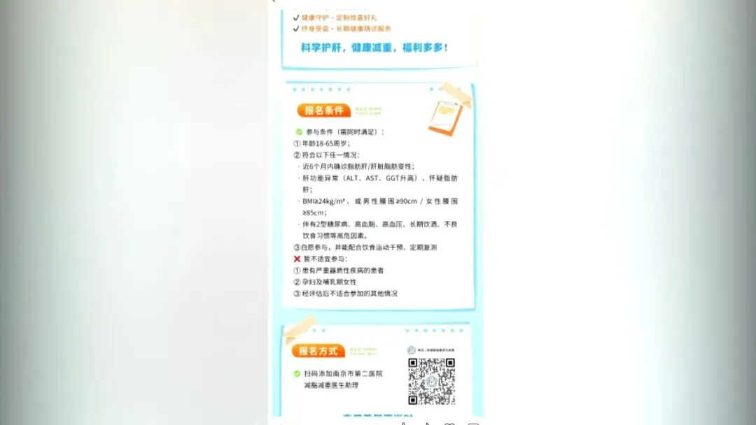 记者了解到,南京市第二医院推出脂肪肝健康挑战赛,招募参赛者名额为100名,年龄在18到65周岁之间,近6个月内确诊脂肪肝、或肝功能异常、怀疑脂肪肝,以及肥胖、二型糖尿病等患者可以关注医院微信公众号报名参加。