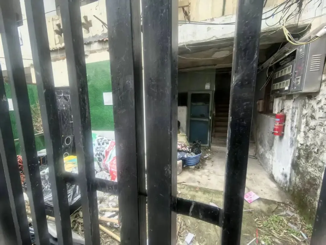 透过栅栏往里看,原本应该是居民活动的地面空间,如今杂草丛生,角落里还堆满了无人清理的生活垃圾,一片荒凉。