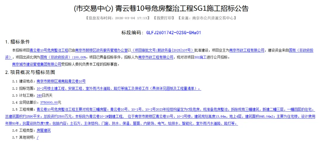 根据官方招标公告,青云巷10号危房整治工程今天正式开标。这个建于1958年、鉴定为C级的危房,即将通过“原拆原建”重获新生。
