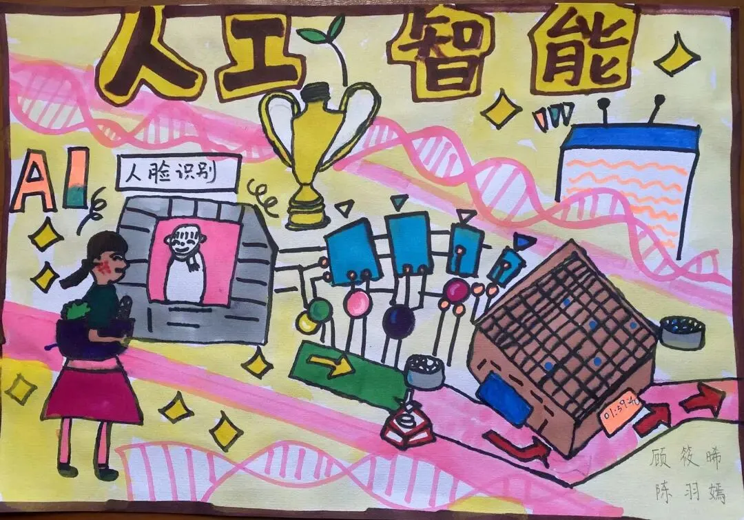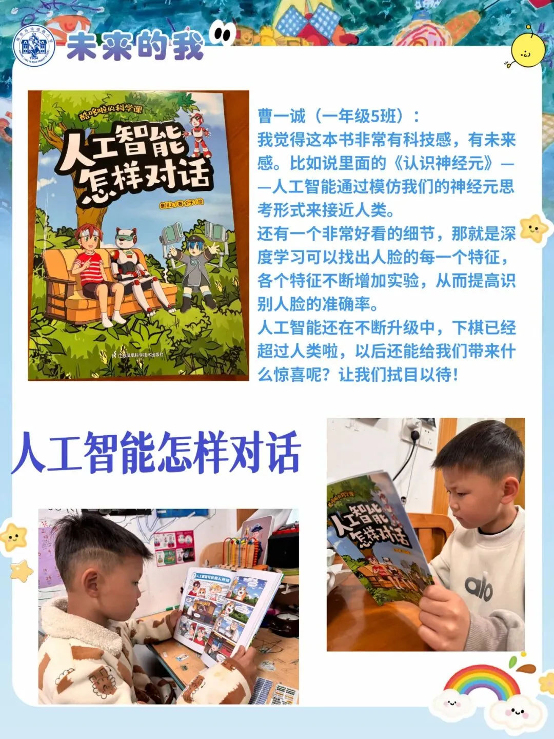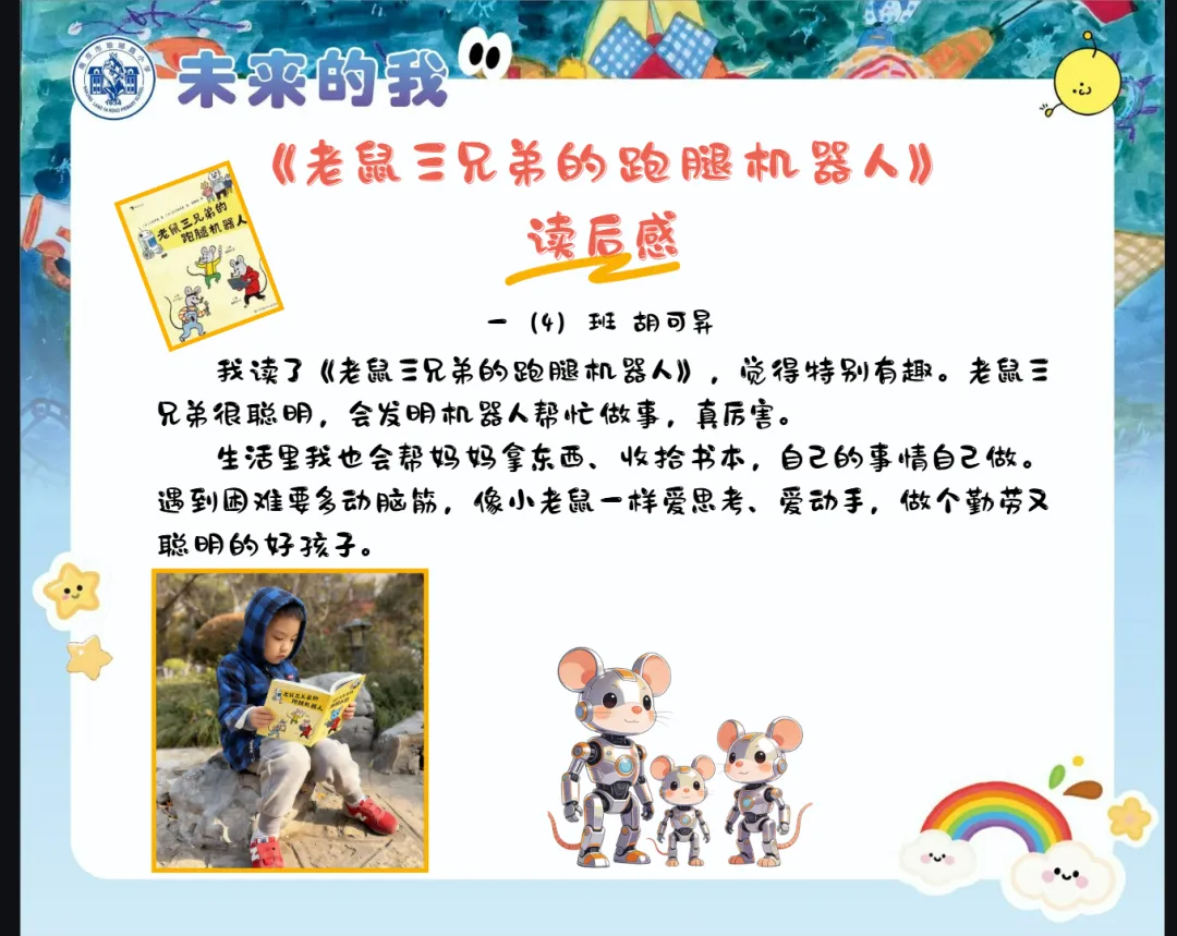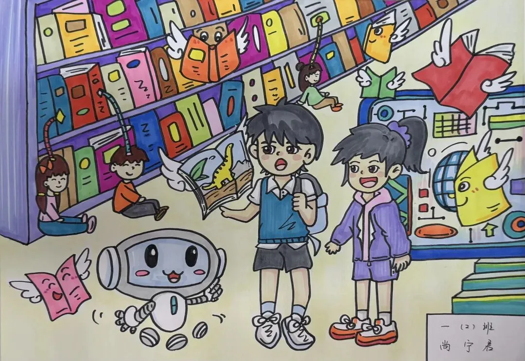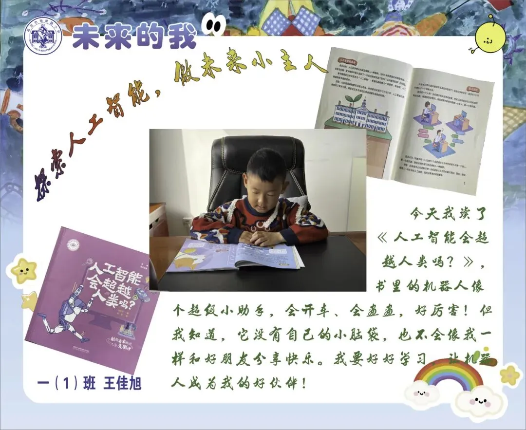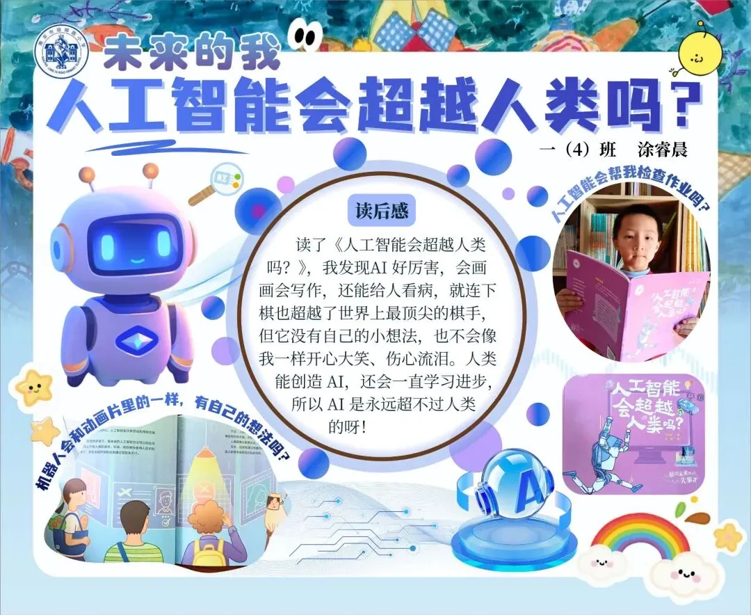 围绕本次主题综合实践活动,学校为一年级级部的小兰芽们精心挑选了趣味科普阅读书目,有《老鼠三兄弟的跑腿机器人》《酷哆啦的科学课:人工智能怎样对话》《我是未来科学家:人工智能会超越人类吗?》《AI小精灵:人工智能奇幻之旅》。同学们结合书籍内容与故事特点,用角色档案卡、成长轨迹图、场景插画、续写故事、阅读感受等多种形式,灵动展示自己的阅读收获与奇思妙想,在书香中遇见AI,在阅读中点亮童心。