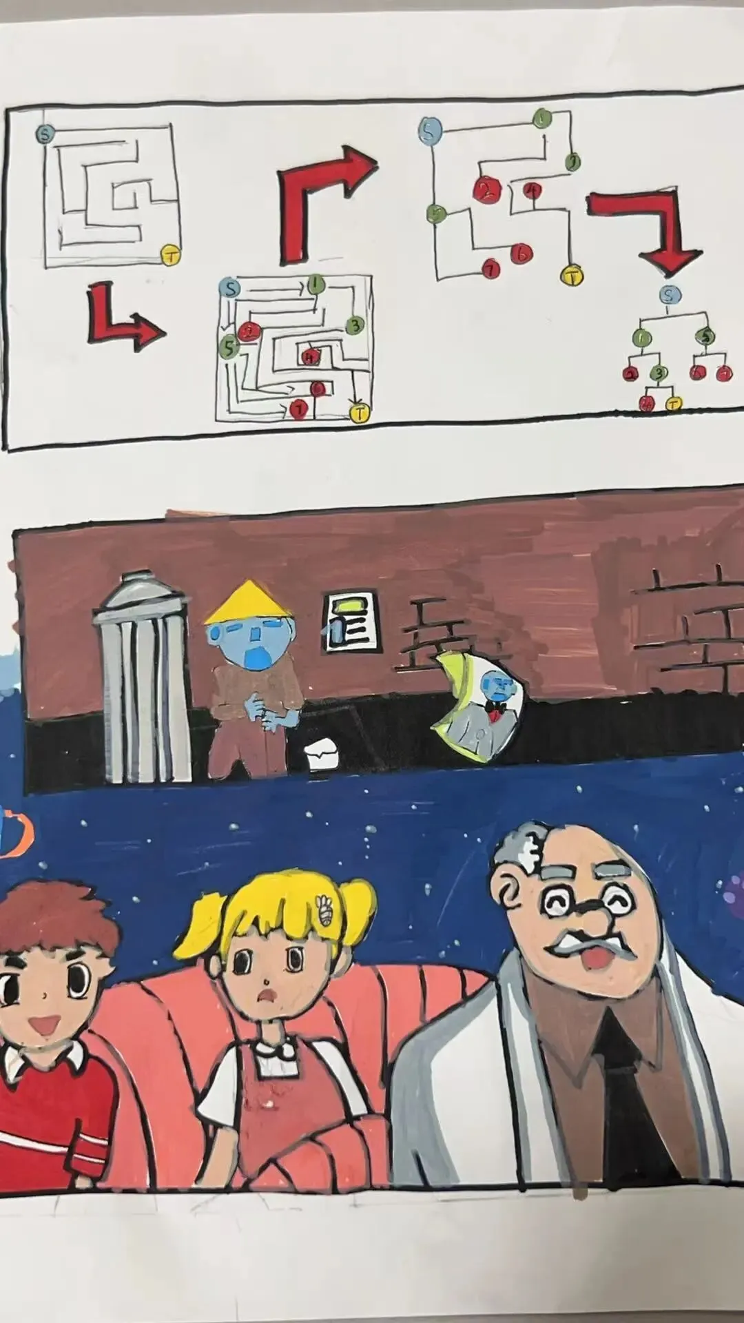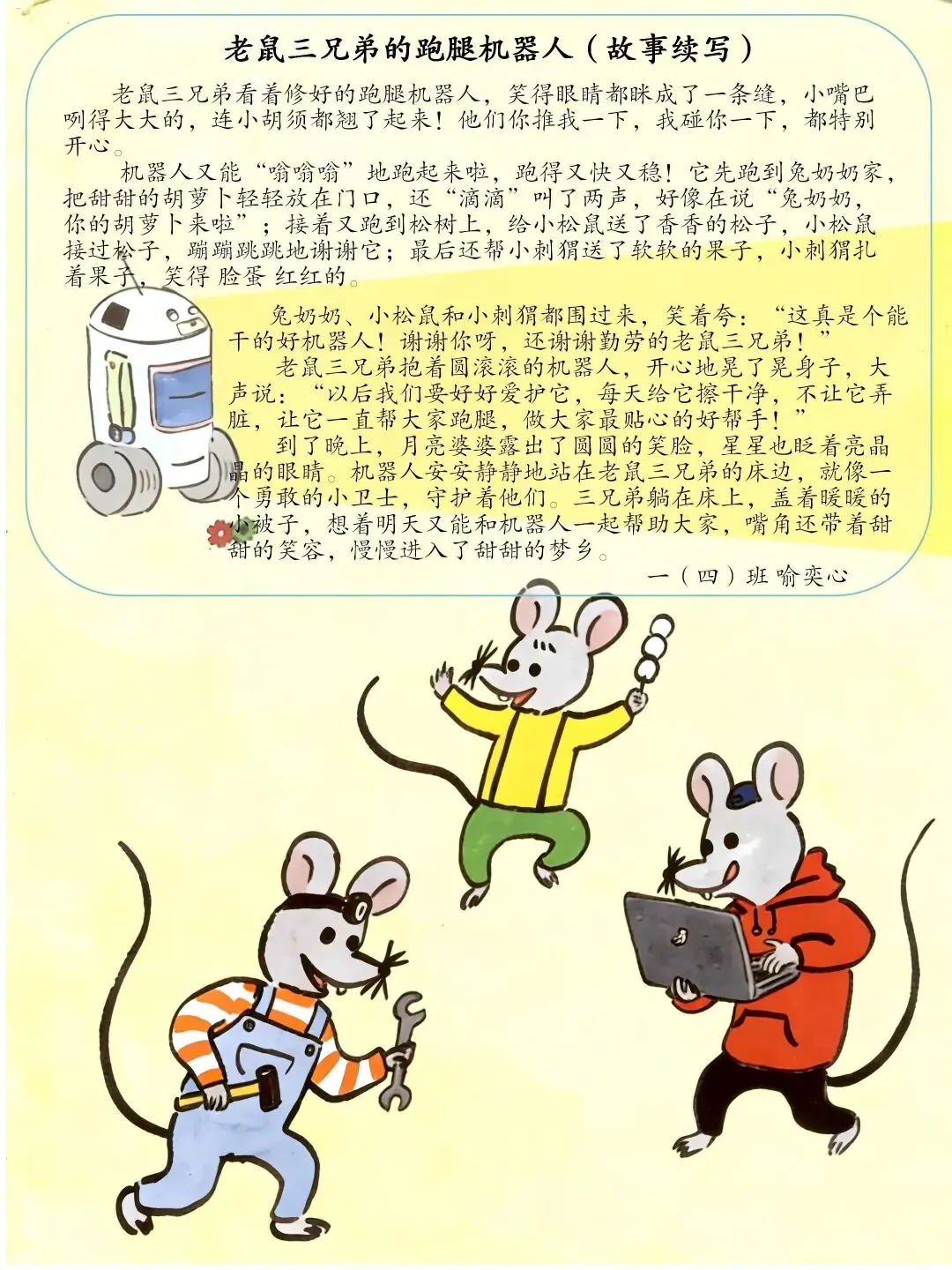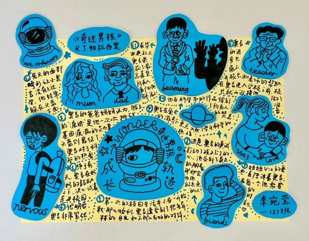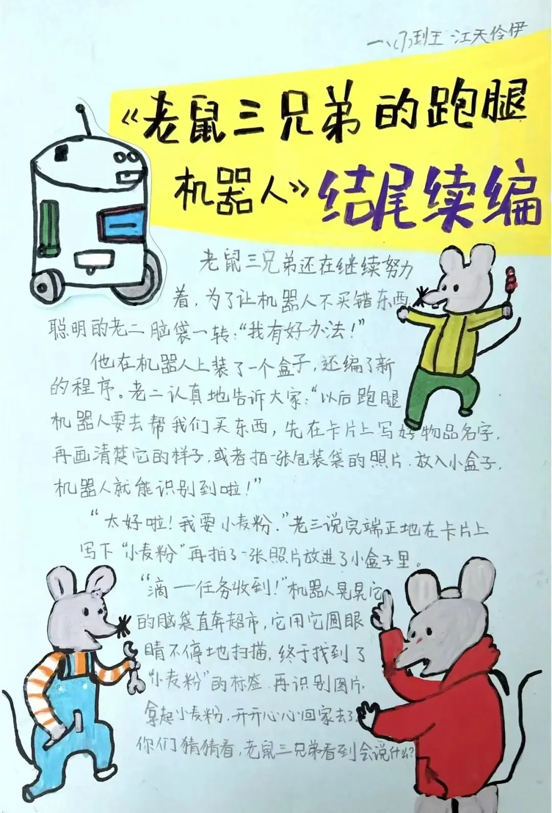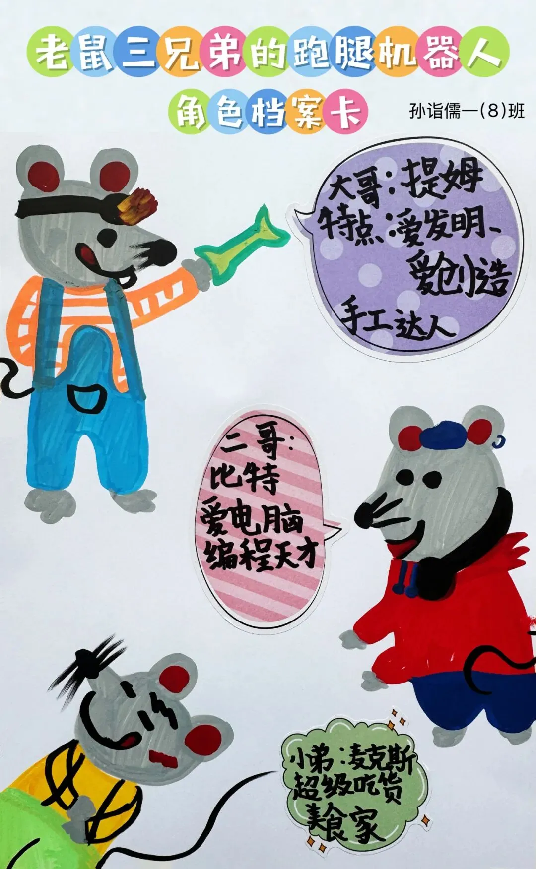 围绕本次主题综合实践活动,学校为一年级级部的小兰芽们精心挑选了趣味科普阅读书目,有《老鼠三兄弟的跑腿机器人》《酷哆啦的科学课:人工智能怎样对话》《我是未来科学家:人工智能会超越人类吗?》《AI小精灵:人工智能奇幻之旅》。同学们结合书籍内容与故事特点,用角色档案卡、成长轨迹图、场景插画、续写故事、阅读感受等多种形式,灵动展示自己的阅读收获与奇思妙想,在书香中遇见AI,在阅读中点亮童心。