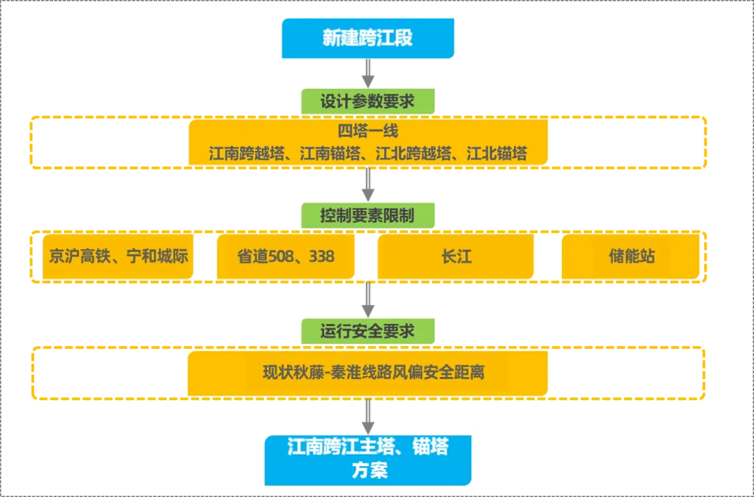 在规划编制中,一方面,严格执行输变电工程技术标准,统筹长江航道、防洪退让、京沪高铁、城市道路等空间管控因素,经科学设计、严谨论证,确定了江南、江北的2座跨江主塔、2座跨江锚塔“四点一线”的跨江通道方案。