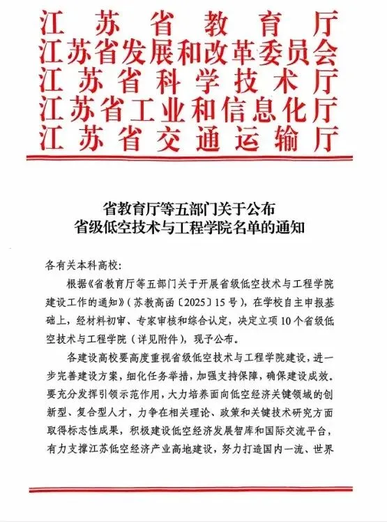 2025年底,江苏省教育厅联合省科技厅、省工信厅等多部门启动了省级特色学院评审工作。此次省级特色学院建设,聚焦低空经济和网络安全等重点领域,旨在遴选一批学科优势突出、办学特色鲜明、产教融合扎实的标杆学院,为江苏打造具有影响力的产业科技创新中心提供强有力的人才与智力支撑。