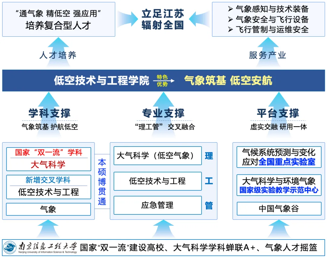 低空技术与工程学院依托学校大气物理学院建设,学院立足学校 “双一流” 建设学科大气科学,以“低空气象与飞行安全”为特色,涵盖气象感知与技术装备、气象安全与飞行设备、飞行管制与运维安全方向,旨在建成大气科学(低空气象)、低空技术与工程、应急管理等“理工管”专业集群,形成低空技术与工程本硕博贯通的人才培养体系。通过局-校-企深度协同,培养理工管复合型专业人才,推动创新技术转化,制定标准与解决方案,为低空经济安全、规模化发展提供技术支撑与人才保障,打造我国低空飞行环境安全保障领域的科技创新和高端人才培养高地。