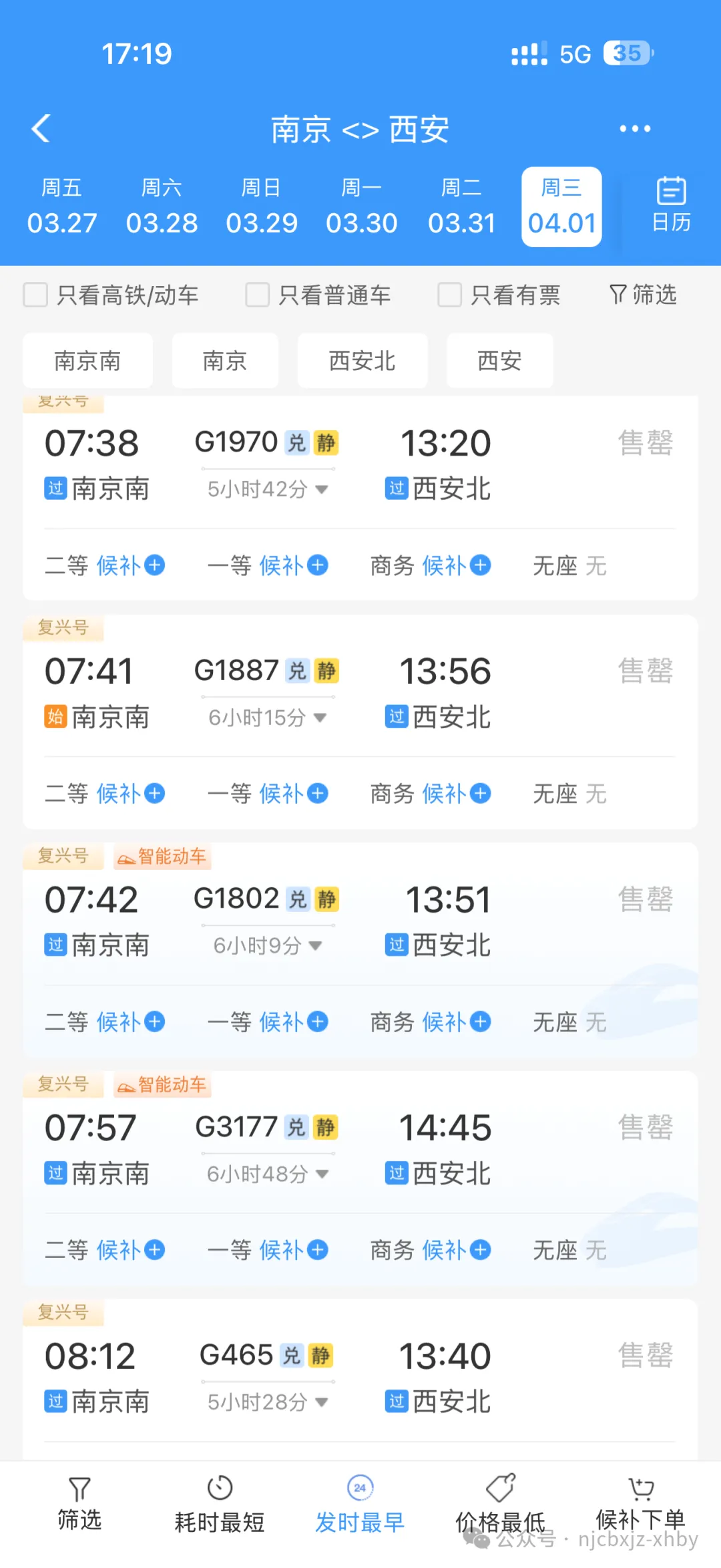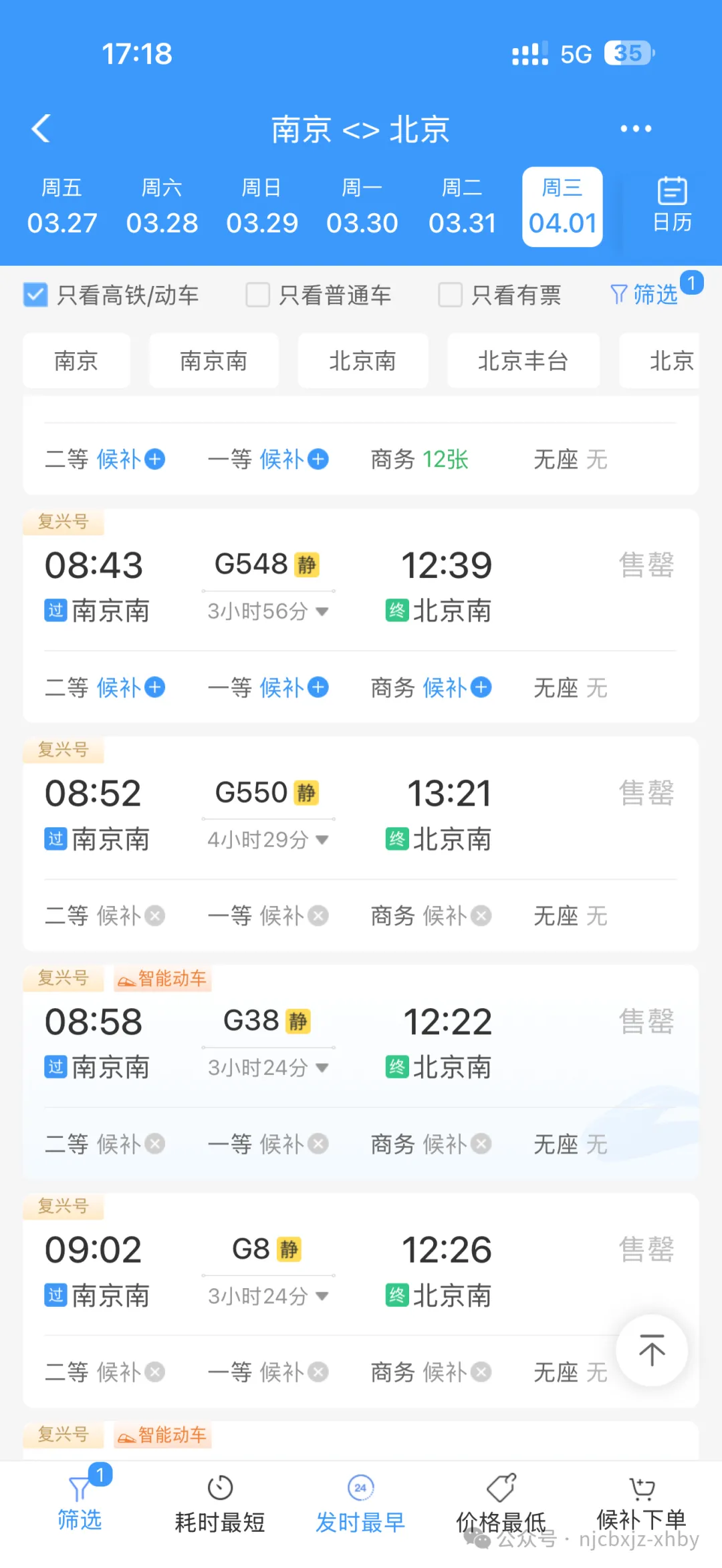 从南京到北京的4月1日众多班次高铁,都显示售罄,部分车次显示“当前席别候补人数已满”。从南京到西安,3月31日晚间出发的卧铺更是售罄;4月1日当天,到达西安比较早的高铁班次也一票难求。