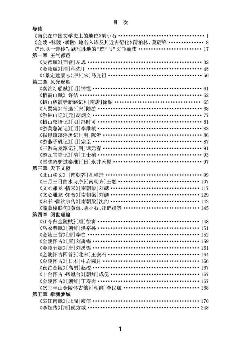 下面对于编选文本的分章略加说明。选本共分五章,即五个专题:王气都邑、风光形胜、天下文枢、阅世理窟及牵魂梦域。这五个专题也可以说是我想和大家一起走进南京的五个视角。