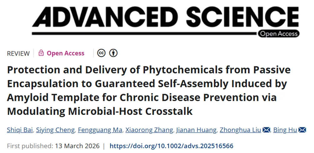 2026年3月13日,南京农业大学食品科学技术学院胡冰教授联合湖南农业大学刘仲华院士团队在国际顶级期刊《Advanced Science》(Q1,中科院1区Top,IF=14.1)在线发表题为" Protection and Delivery of Phytochemicals from Passive Encapsulation to Guaranteed Self-Assembly Induced by Amyloid Template for Chronic Disease Prevention via Modulating Microbial-Host Crosstalk"的综述性论文。