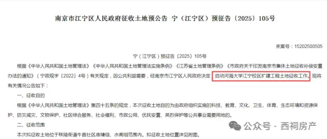 近期,宁区人民政府官网发布征收土地预公告,启动河海大学江宁校区扩建工程土地征收工作,拟征收土地位于秣陵街道牛首社区庙塘组、水阁组范围内。这意味着河海大学江宁校区也即将扩容。