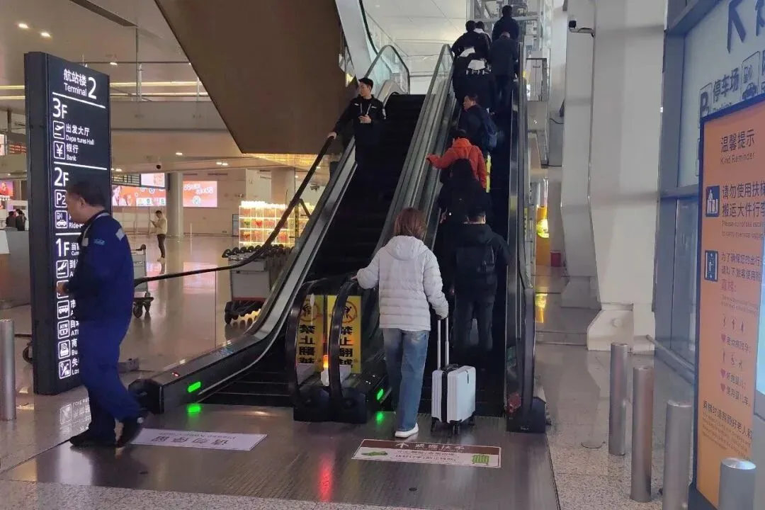 T2 国内到达层扶梯上线自主研发的实时影像分析智能识别系统,当旅客走近扶梯,摄像头就能秒速捕捉现场画面,针对旅客携带大件行李、携老带小家庭及客流高峰等场景,智能快速分析,同步触发警示灯闪烁与对应童声语音提醒,精准关照每一位需要帮助的旅客。