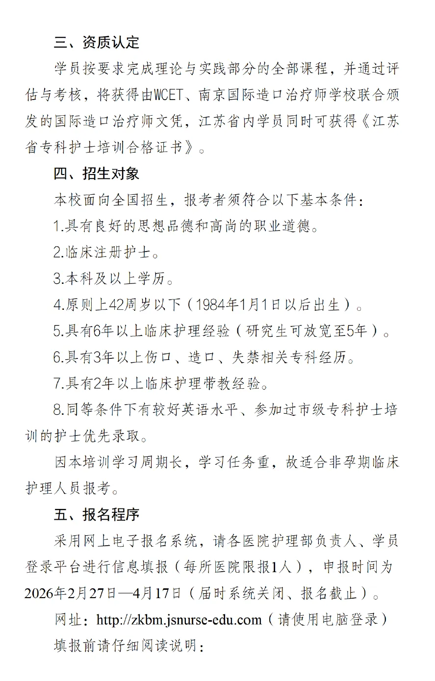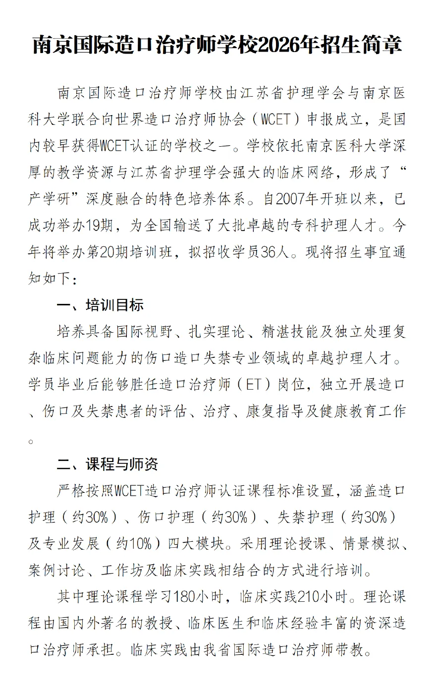 南京国际造口学校2026年招生简章