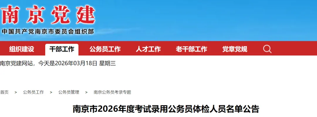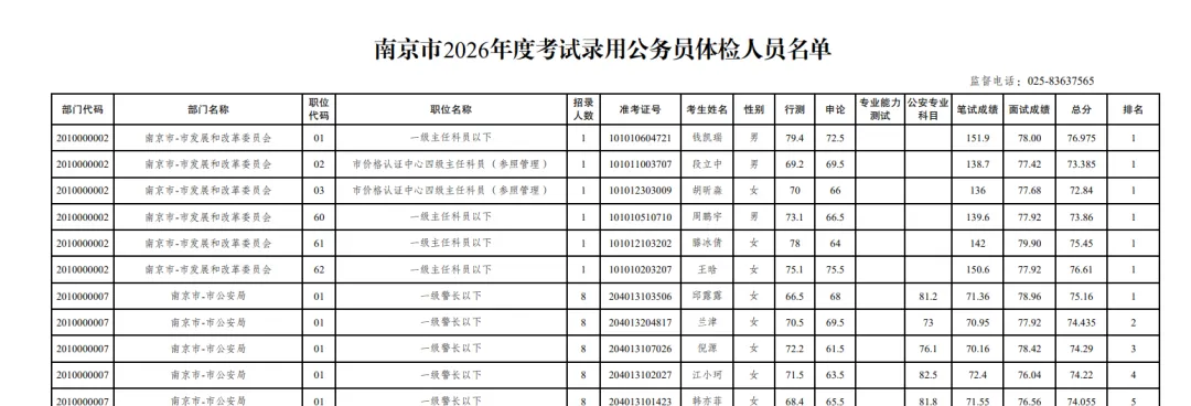 南京市2026年度考试录用公务员面试已经结束。各招录机关按照与拟录用人数1:1的比例,根据报考者考试总成绩从高到低的顺序,确定了进入体检环节的人选,现予以公布。经研究,定于3月21日至24日在我市公务员考录定点医疗机构分批次组织实施体检。入围体检考生根据招录机关的通知,及时登录南京人事考试网打印《体检通知书》,并按要求做好体检准备。