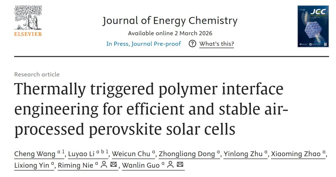 Cheng Wang , Luyao Li, Weicun Chu, Zhongliang Dong, Yinlong Zhu, Xiaoming Zhao, Lixiong Yin, Riming Nie, Wanlin Guo. Thermally triggered polymer interface engineering for efficient and stable air-processed perovskite solar cells. Journal of Energy Chemistry,2026,117: 523-532.https://doi.org/10.1016/j.jechem.2026.02.033