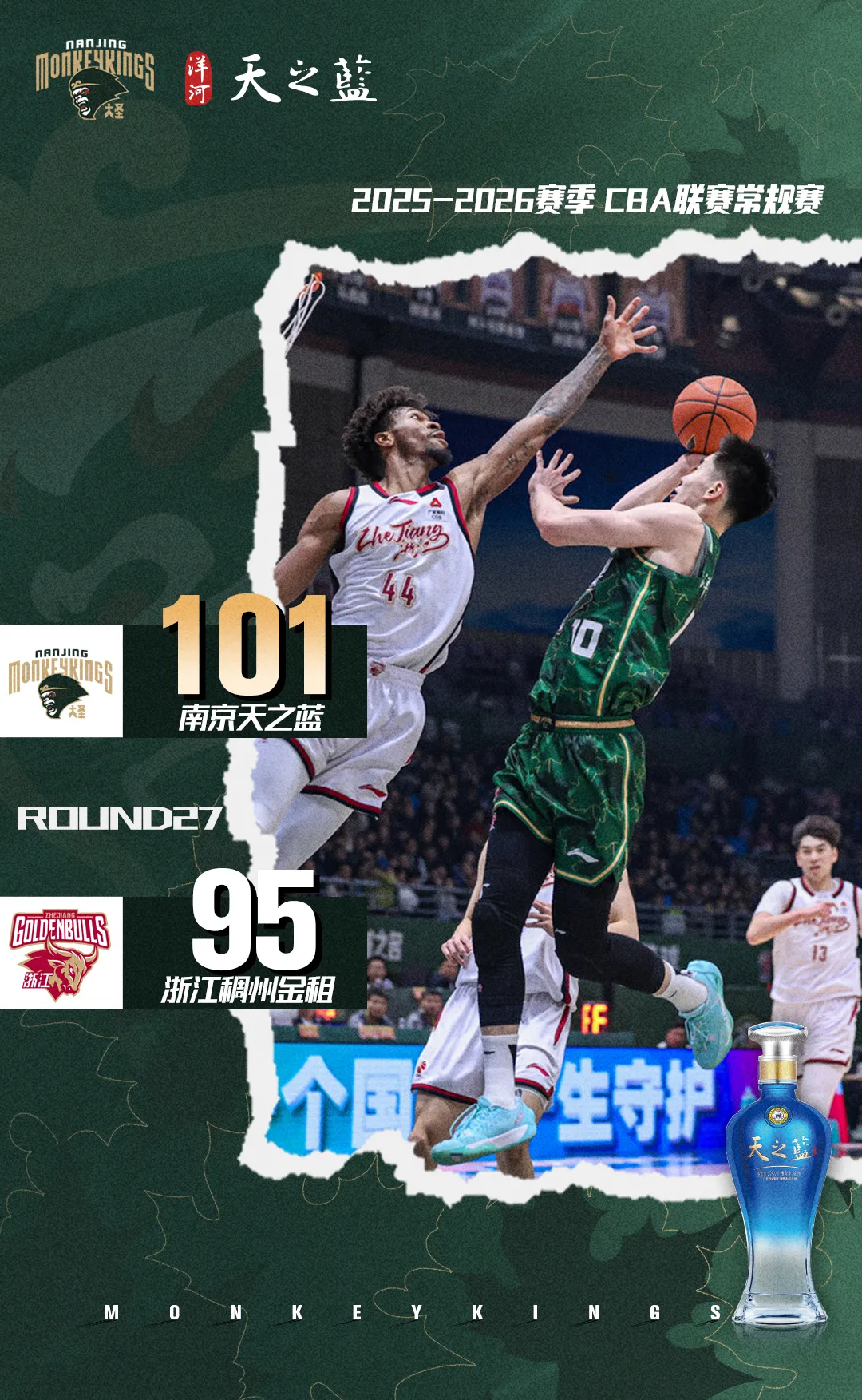 末节决战,柏清禁区取分,安德鲁斯上篮打进。郭昊文再突篮下,程帅澎两罚中一,赵柏清接郭昊文分球,三分迎射约翰逊。陆文博三分也有,郭昊文单手劈扣点燃全场,吴前神奇压哨三分打板命中。邬挺嘉、郭昊文接连命中罚球帮助球队取得领先,约翰逊、吴前两罚中一,郭昊文连得4分。琼斯、王仔路两罚全中,程帅澎抢断上篮,球队立即叫出暂停调整。汉兹上下步拿下关键两分,安德鲁斯弧顶三分强势命中。邬挺嘉再上罚球线稳稳拿下两分,随后球队提升防守强度造成对手接发球失误,郭昊文转身上篮再造杀伤两罚全中,球队领先4分。浙江队暂停调整,安德鲁斯打成快速2分,汉兹、郭昊文接连造成对手犯规命中两罚。全场比赛结束,南京天之蓝101-95浙江稠州金租。