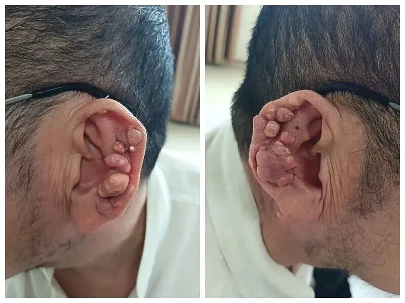双手、双脚、膝关节上鼓满了硬邦邦的痛风石,连耳朵上都能摸到凸起的小疙瘩,活像长了串小石子。