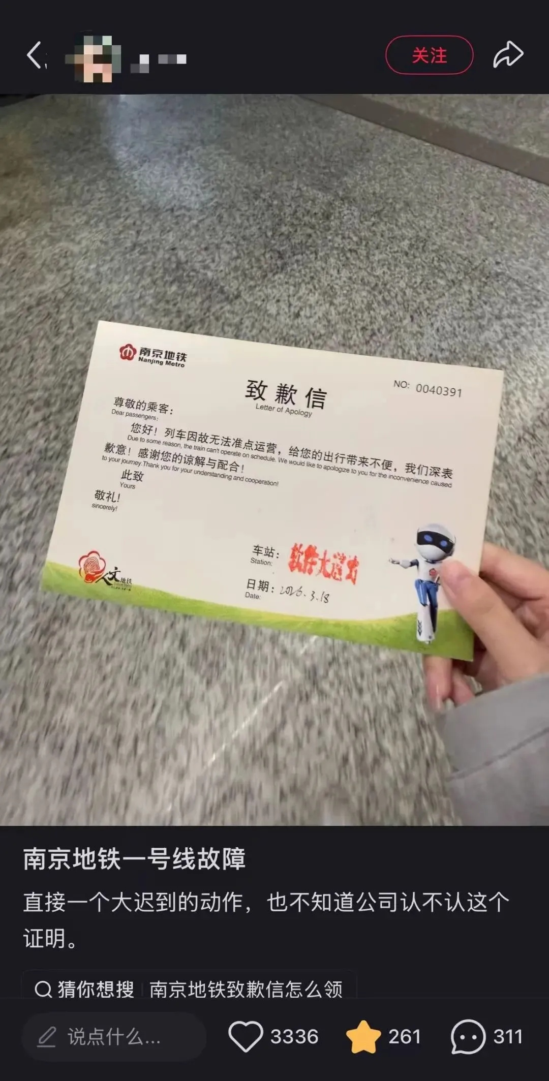 记者注意到,在各大社交平台,不少网友纷纷晒出了南京地铁的致歉信。南京地铁的致歉信引发了广大网友讨论,网友表示“很人性化”,也有网友好奇致歉信有什么用途?