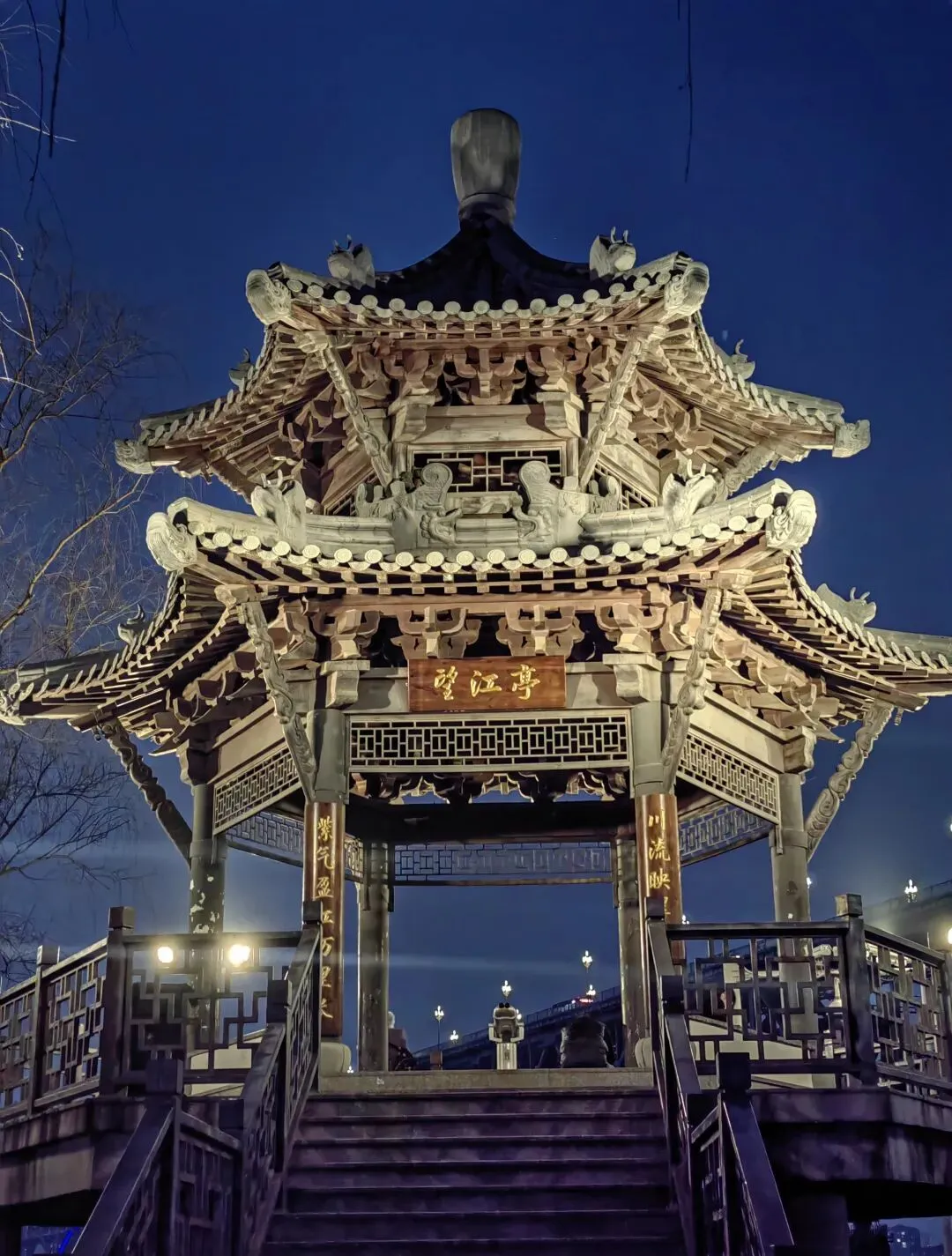 一排排白玉兰路灯暖黄发光,桥拱下的蓝色灯带跟着江水流动,灯光碎在江面上,像撒了一整条星河。