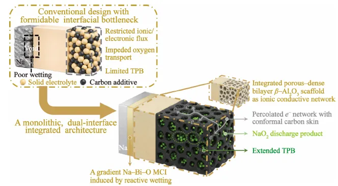 本研究提出并验证了一种通过一体化陶瓷骨架实现全固态钠-氧气电池双界面化学集成的创新策略。通过构建多孔-致密β″-Al₂O₃陶瓷,并分别以共形碳层和反应润湿的Na-Bi-O梯度中间相精准修饰正、负极界面,成功将传统固态电池中松散、高阻的物理接触转变为连续、低阻的化学融合。该设计不仅构建了体相三相反应区,释放了4012 mAh g⁻¹室温容量,更将钠负极界面稳定性提升至超过14000小时。原位谱学与质谱联用技术揭示了固态环境对NaO₂反应路径的独特稳定机制。这项工作为破解固态多相界面难题提供了普适性设计蓝图,为发展高安全、高比能固态金属-空气电池开辟了新路径。