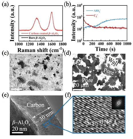 研究团队首先通过共烧工艺制备了多孔-致密一体化β″-Al₂O₃陶瓷。致密层作为隔膜提供高离子电导率(室温下5.8×10⁻⁴ S cm⁻¹),而多孔层则作为正极的“离子高速公路”骨架。为解决正极导电性问题,团队利用等离子体增强化学气相沉积(PECVD)在多孔骨架内壁精准沉积了一层仅30 nm厚的共形石墨化碳层。这一超薄碳网络构建了三维电子传导通路,同时保留了充足的孔隙用于氧气扩散和放电产物储存,将传统点对点接触的三相界面扩展为整个多孔骨架内的体相界面。