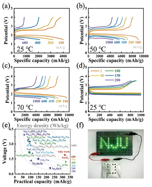 在对称电池测试中,改性后的Na|陶瓷|Na界面实现了超过14000小时的超稳定循环,临界电流密度从0.25 mA cm⁻²提升至0.95 mA cm⁻²。基于该一体化骨架的全固态钠-氧气电池,在室温下展现出高达4012 mAh g⁻¹(基于碳质量)的放电容量,并在1000 mAh g⁻¹的限定容量下稳定循环200圈,过电位低至0.5 V。即使在70°C高温下,电池在1000 mA g⁻¹的大电流密度下仍能释放4906 mAh g⁻¹的容量。团队还成功组装了小型软包电池,在环境空气中点亮了NJU的LED阵列,并实现了597 Wh kg⁻¹的实用化能量密度。