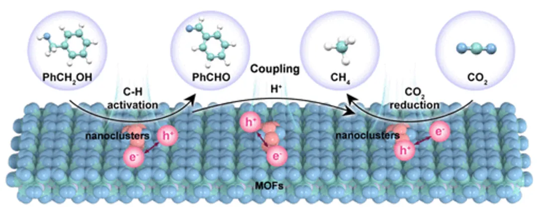 图1. 用于CO2光还原为CH4并耦合C-H键活化的非对称双金属界面的示意图:将半导体纳米团簇锚定在富含空位的MOF中构建非对称的双金属界面,可以同时实现CO2光还原为CH4并耦合C-H键活化以进行苯甲醇氧化为苯甲醛。