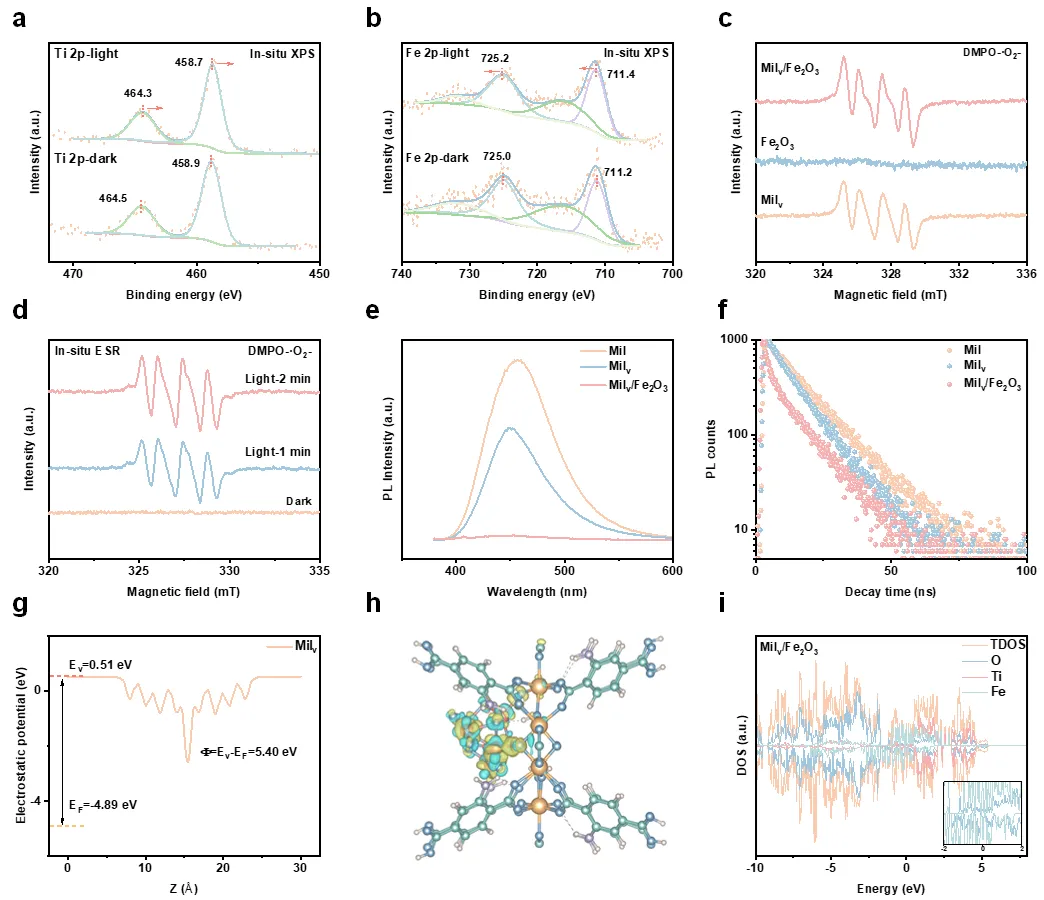 图3. 界面载流子转移的动力学研究。原位实验表征和光谱学实验证明Milv/Fe2O3异质结构可以实现载流子动力学的快速转移。