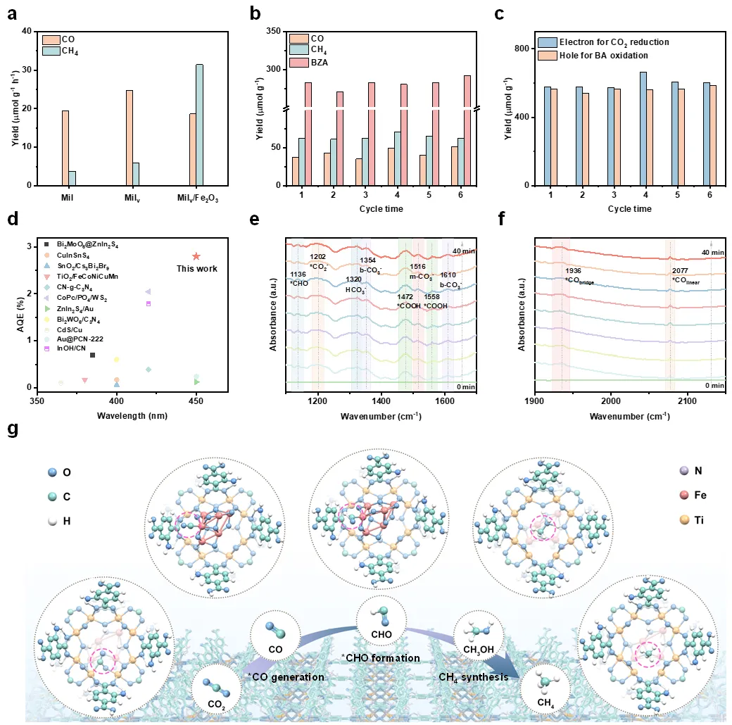 综上所述,本研究报告了一种通用策略,即通过将半导体纳米团簇锚定在富含空位的金属有机框架材料(MOFs)中,构建非对称双金属活性中心,实现高效二氧化碳光催化制甲烷与C-H键氧化偶联。原位实验与理论计算表明,界面空位可诱导形成新化学键,作为原子级精确的Z型电荷转移路径。此外,界面Ti-Fe双金属活性位点可通过d-p杂化稳定CO中间体并生成CHO中间体,最终在450 nm波长下实现2.8%的表观量子效率(AQE)及87.0%的甲烷选择性。同时,Fe₂O₃产生的光生空穴可通过C-H键活化将苯甲醇(BA)完全选择性(100%)氧化为苯甲醛(BZA)。这种用于太阳能驱动二氧化碳与生物质衍生醇串联转化的非对称界面双金属位点,凸显了光生电子与空穴同时利用的独特协同效应。本研究为通过理性设计非对称双金属界面优化电子转移路径及级联催化中心、推动先进催化发展提供了新思路。