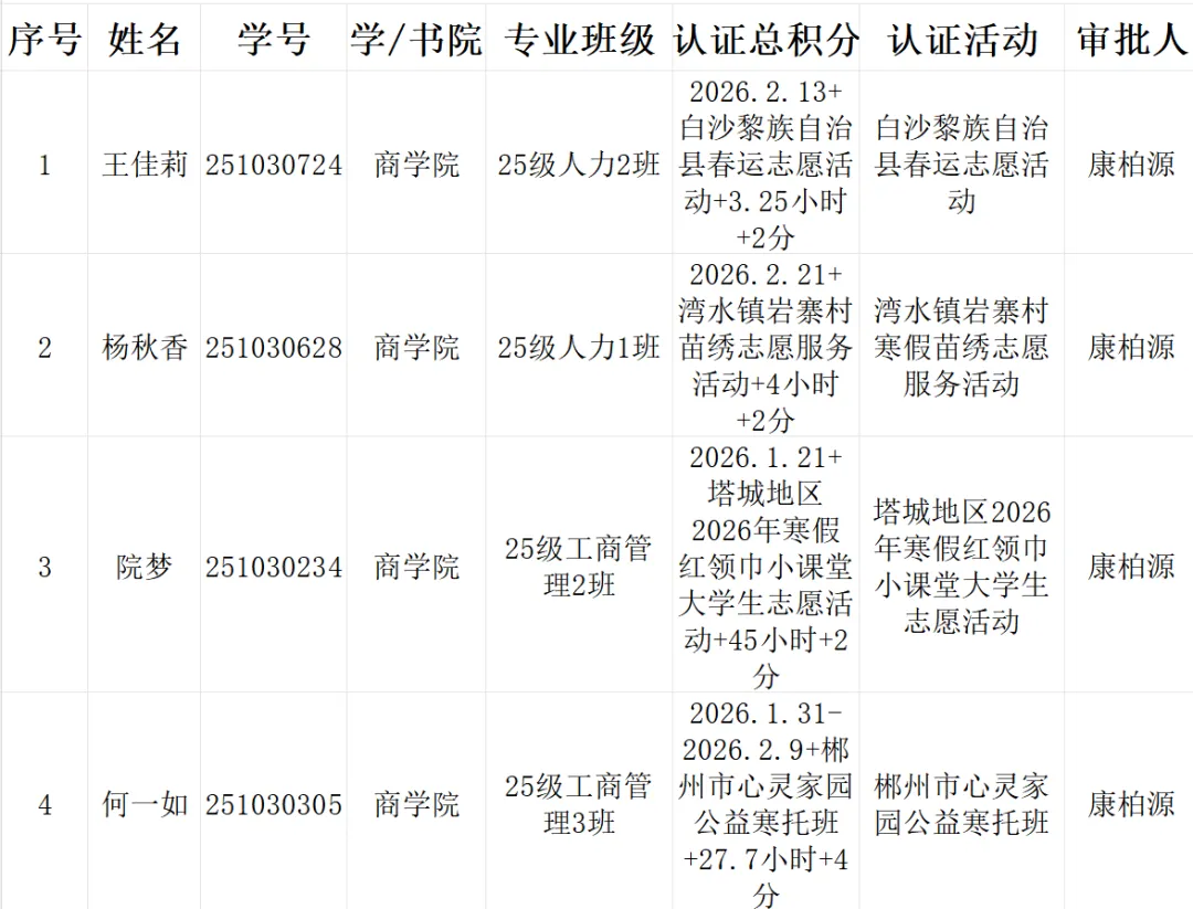 为规范校外志愿活动管理,保障各位同学志愿服务时长的准确性与有效性,商学院青年志愿者协会启动了寒假个人校外志愿认证工作,现已顺利完成全部审核流程。现将本次寒假个人校外志愿认证结果进行公示,具体如下: