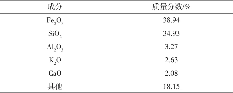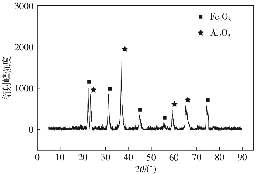 本文采用的是刘方等添加铝元素纤维的方式进行强化处理的复合型载氧体,以贫铁矿作为载氧体的基体(详细化学组成见表1),Al2O3纤维作为增韧材料,通过机械混合和高温煅烧来进行制备,其机械强度为6.3N,载氧率约为1.13%。将Fe2O3/Al2O3载氧体的晶体结构通过X射线衍射(X-ray diffraction,XRD)进行了表征,如图1所示,可以观察到该复合载氧体中含有大量的Fe2O3和Al2O3晶体,这表明在该制备条件下,载氧体的结晶过程形成了完整的晶相,在XRD图中并未显示出其他形态的尖晶石。
