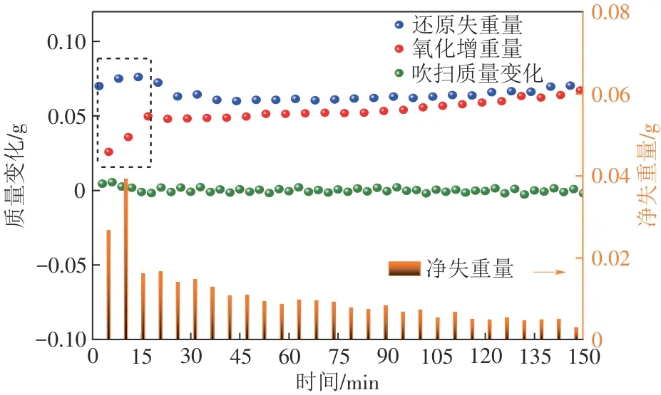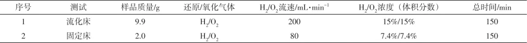 在流化床循环测试中,将9.9g完全氧化的增韧贫铁矿颗粒(粒径0.2~0.3mm)加入反应器,待床层温度稳定在900℃后开始循环。循环过程中,持续通入2.5L/min氮气作为载气,并在还原阶段额外引入200mL/min氢气,氧化阶段额外引入200mL/min氧气,还原与氧化各持续2min,单循环时间为6min,整个循环实验过程持续150min,25个循环。在固定床循环测试中,样品质量减少为2.0g,氮气流速减少为0.1L/min,氢气和氧气流速减少为80mL/min,其他参数与流化床循环实验一致,如表2所示。实验中FB-TGA系统持续监测样本质量与温度变化,以便后续进行数据分析与特征表征。