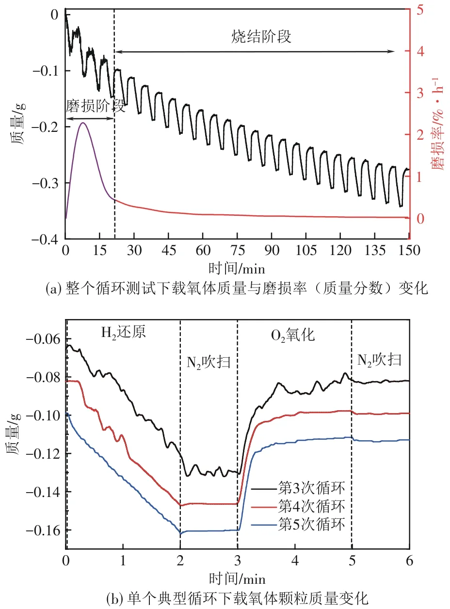 在氧化还原循环测试中,载氧体颗粒的实时质量变化如图3所示。整个循环过程可分为两个阶段。在机械磨损主导阶段(第1~4次循环),前4次循环内颗粒总质量快速下降0.098g(占总失重量的33.33%),其中前2次循环的磨损率高达2.272%,随后在第2~4次循环间骤降至0.427%。这是因为在刚开始的流化阶段,非球形颗粒的凸起部位在流化碰撞时承受集中应力,使它们更易断裂,进而形成微小颗粒。第3次循环后质量曲线逐渐平滑[图3(b)],推测前3个循环中TGA曲线不平滑的原因在于大流量的风速使得颗粒剧烈流化,而在第19min后,流化床的流化程度开始变弱,床内出现局部失流。在烧结主导阶段(第5~25次循环),磨损率持续降低至0,累计失重量为0.196g(占66.67%)。随着循环反应的继续进行,在第10个循环后颗粒的磨损率几乎为0,流化床彻底失流,推测此时强放热的赤铁矿氧化反应导致了OC颗粒的熔融与烧结。