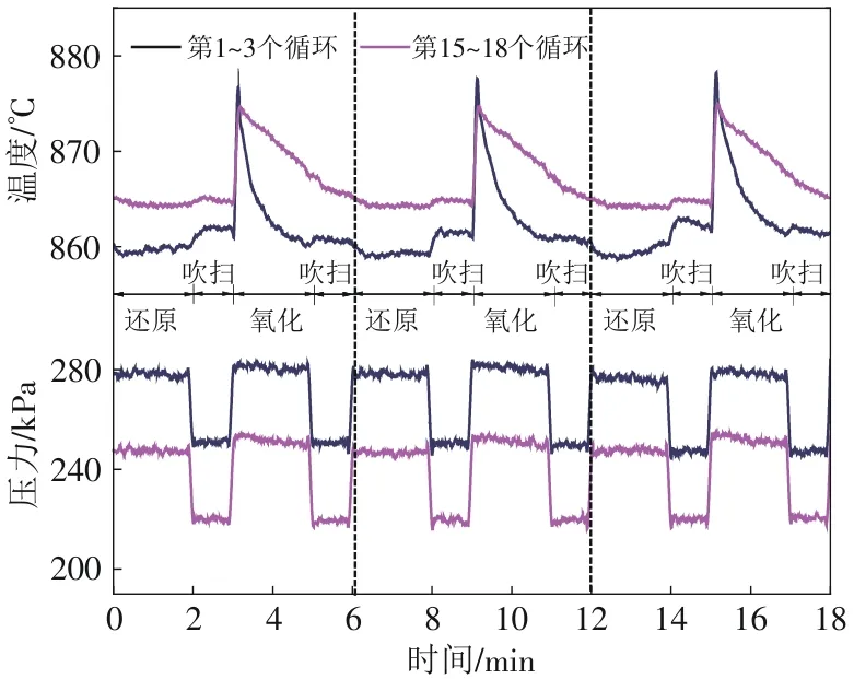 为了深入分析不同阶段温度变化的成因,选取磨损主导阶段和烧结主导阶段的3个循环,将温度与压力的变化曲线相互比较,如图7所示。载氧体颗粒在氧化过程中的温度陡然升高,但在还原过程中却保持相对稳定。这是因为3Fe2O3→2Fe3O4+1/2O2的吸热量较小(∆H=-2.15kJ/mol,900℃),容易被炉子的热惯性和电加热所抵消,因此对床层温度的影响较小。而4Fe3O4+O2→6Fe2O3的氧化反应是个强放热过程(∆H=493.2kJ/mol,900℃),因此出现温度陡升的现象,当温度曲线达到峰值之后,呈现下降的趋势。在第1~3个循环中,温度的下降曲线非常迅速,待吹扫之时才趋于稳定;而在第15~18个循环中,温度在达到峰值后呈缓慢下降的趋势,在吹扫阶段仍然下降直至下次还原。这是因为该过程中颗粒烧结限制了晶格氧的快速释放,并随着循环次数的增大形成团聚。氧化过程中温度升高的斜率和幅度可以间接反应OC的氧化程度,而两个阶段的温度升高斜率相似,这意味着团聚体表面上的颗粒与非团聚体颗粒的氧化反应性相当。此外,氧化阶段床层压力突增约35kPa,这与O2化学吸附引起的体积收缩及气体黏度升高直接相关。