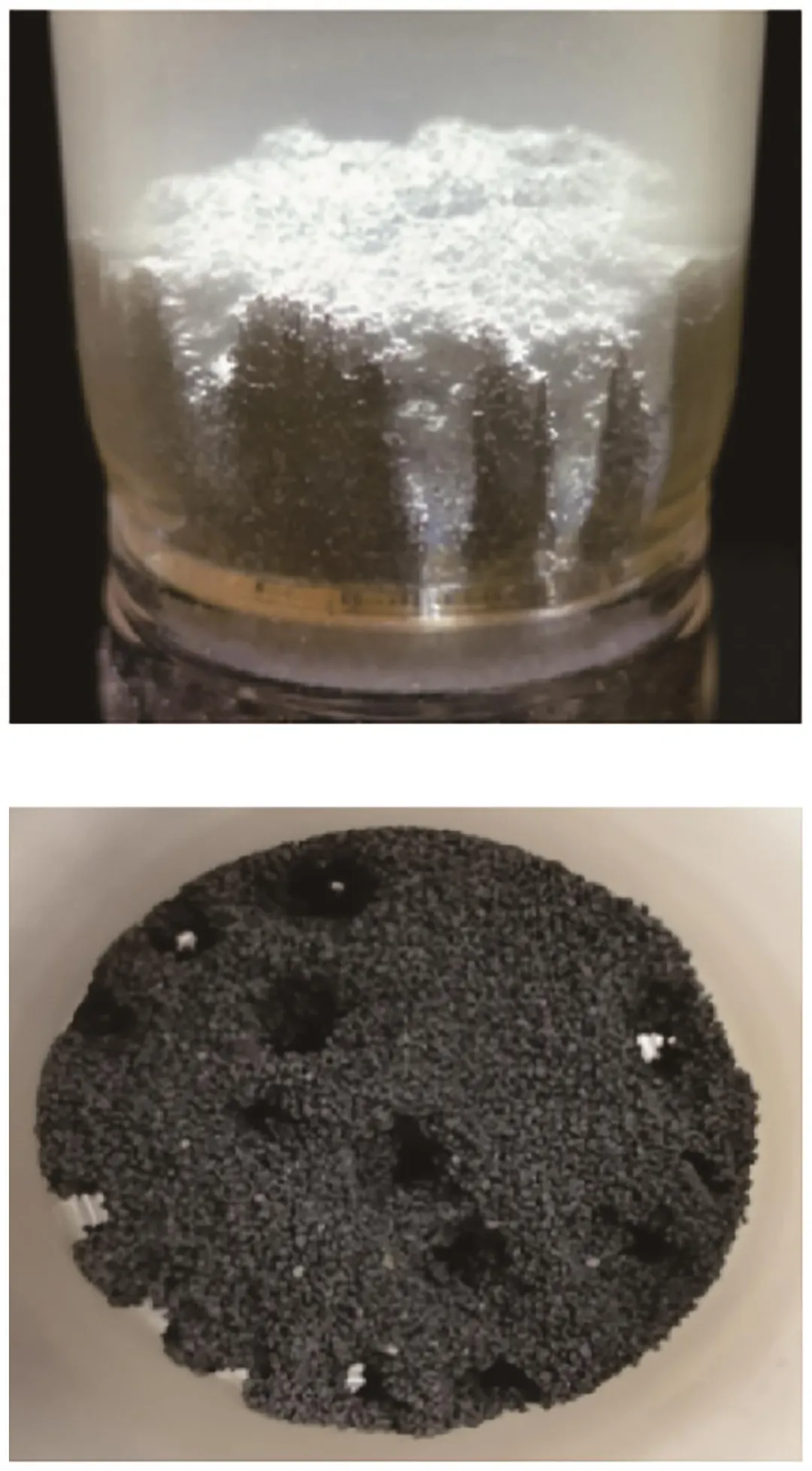 图8展示了在流化床经过25个循环后的OC颗粒图像,结合上面的质量曲线分析可知,最初的几个循环内OC颗粒能够正常流化且反应活性较高,还原失重量与氧化增重量均有所增大。随着循环次数的增加,床层底部开始出现部分烧结。随着烧结和团聚的不断加剧,床层上部的颗粒在氧化过程中不能被完全氧化,使得床层质量下降,而此时气流在床层内形成沟流通道,并在床层上部形成孔隙,使得上层的颗粒能够恢复氧化过程。随着颗粒烧结的加剧和气体分布的不均匀,新形成的团聚层变得更加致密,团聚层逐渐向上层颗粒扩散,最终导致床层完全失流。