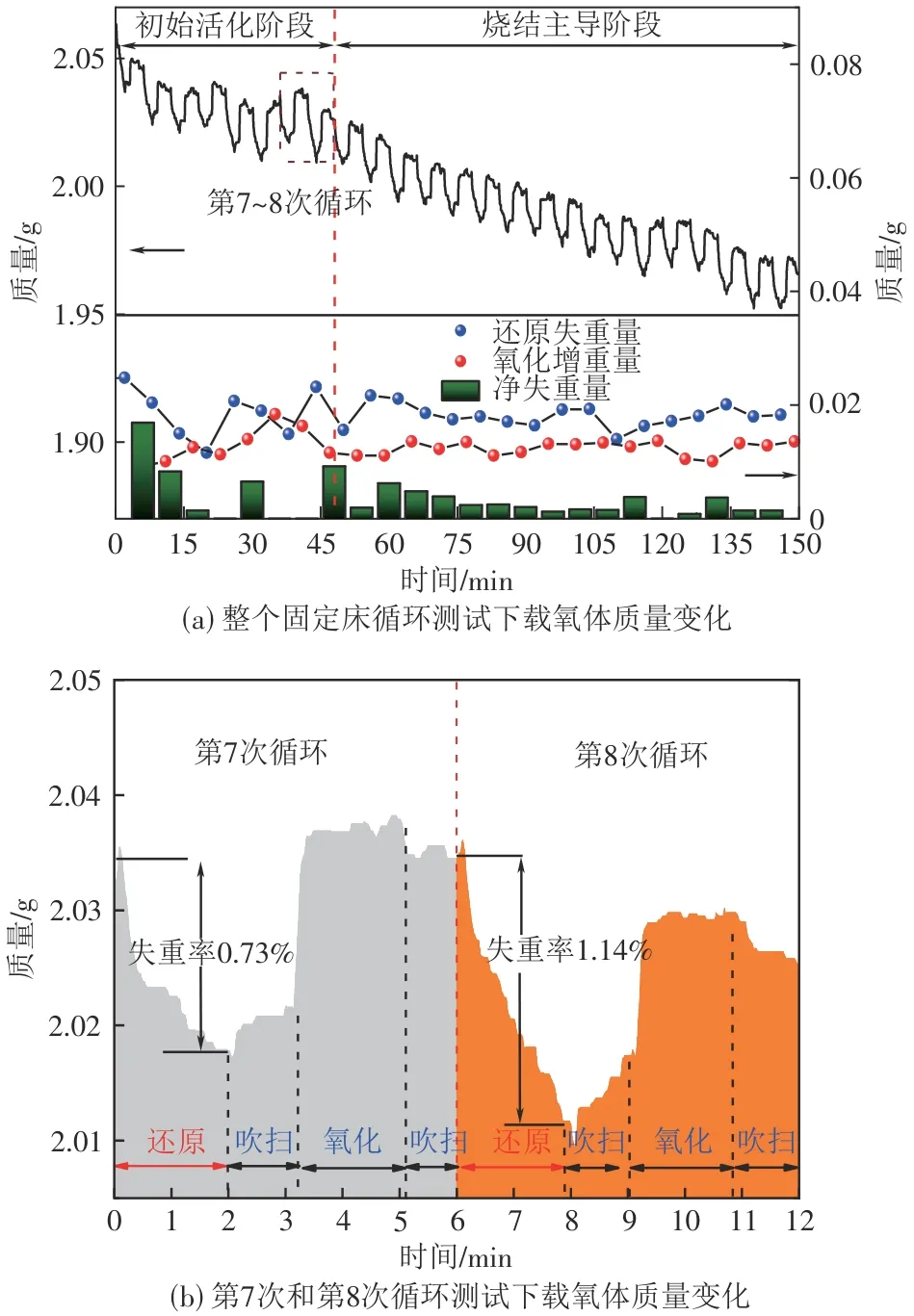 在载氧体循环反应实验中,每个循环内OC颗粒的还原失重量和氧化增重量定义为Δmr,n和Δmo,n[式(2)、式(3)]。