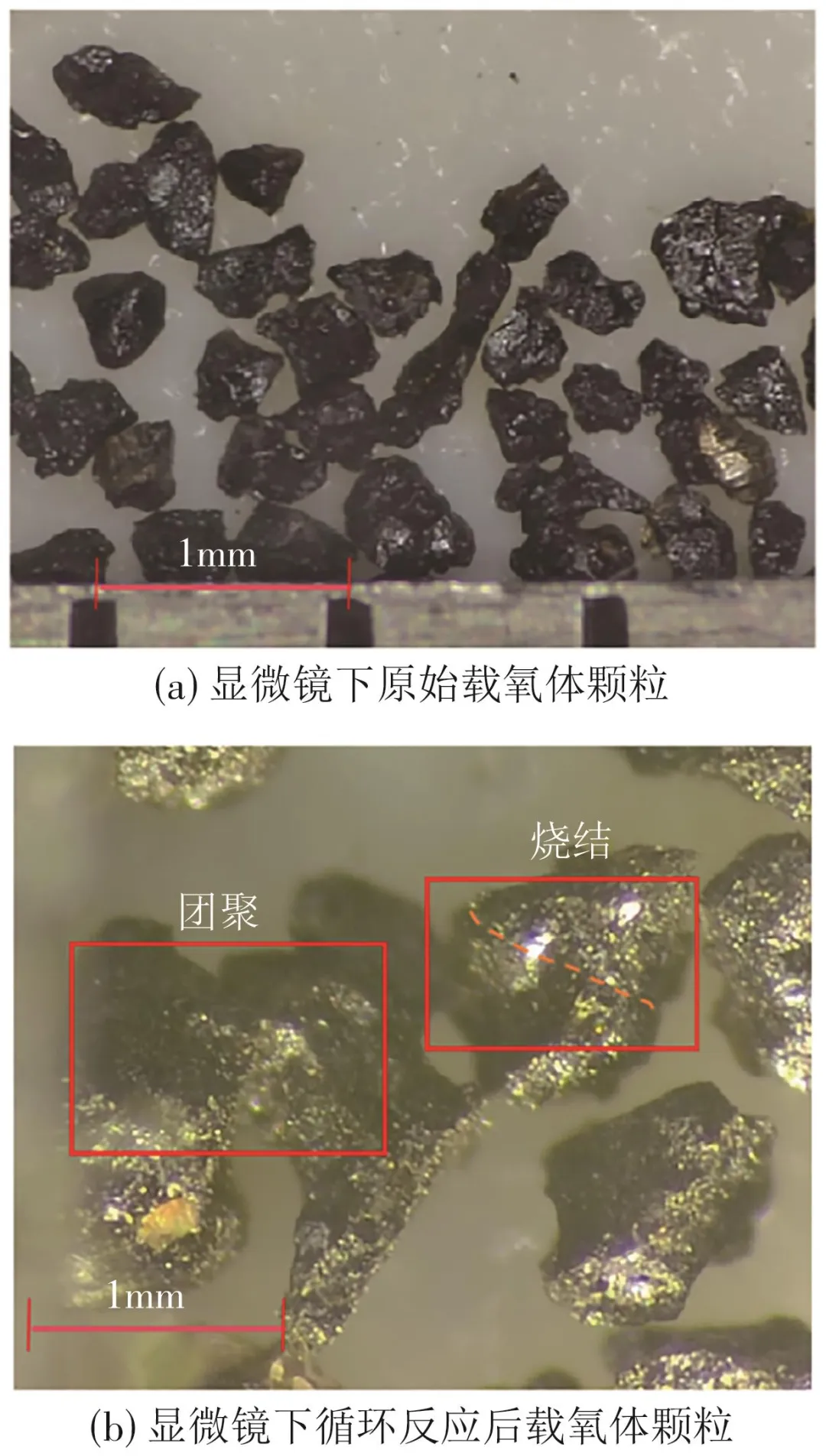 固定床循环反应后的OC颗粒除大部分烧结在布风板上之外,还有部分颗粒呈现分散状态,未形成大规模团聚体。采用光学显微镜对该部分颗粒进行观察,发现与循环反应前的原始颗粒相比,反应后的颗粒表面出现裂纹现象,如图10所示。在固定床运行条件下,这种表面破损源于氧化还原循环过程中颗粒内部化学应力的持续累积。烧结或断裂的颗粒在高温作用下黏合在一起,形成载氧体颗粒的团聚。在固定床的实验中,虽然增韧贫铁矿的初始质量仅为2.057g,且采用低浓度(7.4%)H2还原以及低浓度(7.4%)O2氧化,但该载氧体颗粒依旧发生烧结与团聚,说明该载氧体颗粒发生烧结团聚是其颗粒固有的特性,和床料量及氧化还原的程度无关。