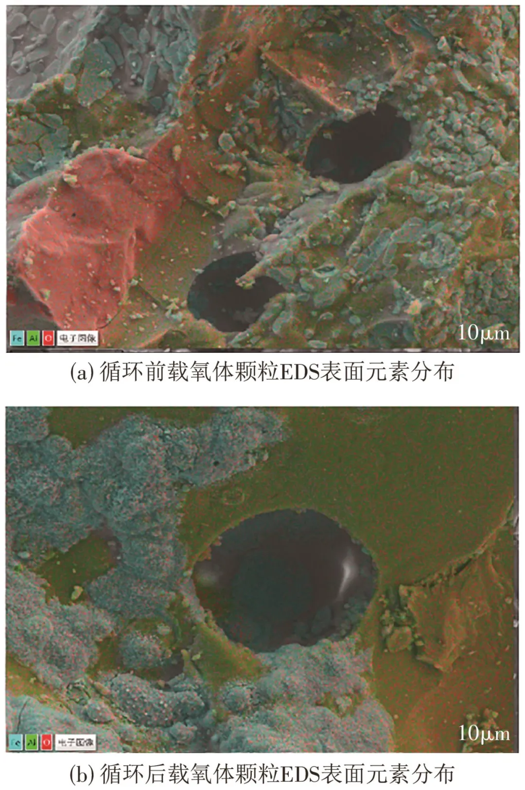 图11展示了OC颗粒循环前后的能量色散X射线光谱(EDS)测试结果,循环后的图像显示Fe单质或是低价态氧化物在颗粒表面相互黏结,并呈粗糙片状出现。结合上文的OC循环反应质量曲线分析,可知在多次氧化-还原循环中在燃料反应器内停留时间过长,载氧体经历深度还原,导致低价态的铁氧化物在颗粒表面析出,由于其塔曼温度较低,因此在燃料反应器高温环境下易发生局部熔融。表3给出了循环反应前后载氧体颗粒表面原子量占比,发现循环前后该OC颗粒表面Al元素占比变化不大,均为9%左右,但Fe元素占比有所增加,从34.61%增加至43.28%,说明Fe原子在循环过程中向颗粒表面迁移。这些Fe氧化物在颗粒表面氧化放热形成熔融态,颗粒表面的熔融态铁相液滴容易在表面张力作用下相互黏结,形成烧结颈,最终导致颗粒团聚,引发流化床失流现象。同时,在循环反应后的固定床内也出现了类似的现象,说明该增韧贫铁OC颗粒在经流化床和固定床循环反应后均出现了烧结。