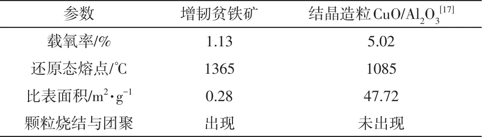 表4将增韧贫铁矿载氧体与新型铜基载氧体的载氧率和熔点进行了对比,发现该增韧贫铁载氧体的熔点较高,载氧率较低,但在流化床以及固定床进行循环反应过程中均发生颗粒烧结,说明OC颗粒的团聚结块和金属的熔点高低及载氧率并无直接关联。该增韧贫铁矿的比表面积仅为0.28m2/g,颗粒表面的熔融态铁相液滴容易在表面张力作用下相互黏结,形成烧结。而长时间循环后的铜基载氧体的比表面积高达47.72m2/g,其中活性金属元素高度分散在Al2O3载体孔隙中,在氧化过程中颗粒表面晶粒放热,因体积收缩而形成的微小液滴嵌入惰性Al2O3孔隙中,惰性Al2O3孔隙隔断微小液珠凝聚的路径,无法凝聚成体积较大的液滴,故不会发生颗粒黏结团聚。因此,为满足载氧体工业应用的可能性,所制备的载氧体应选择活性金属组分高度分散,颗粒表面孔隙发达,能吸收、包容金属液相,阻止金属液相在颗粒表面凝聚形成体积较大的液相,从而有效抑制颗粒的烧结与团聚。