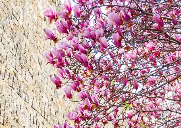 始建于 1386 年的明城墙,与粉白玉兰共同编织出金陵春日的叙事诗。粉嫩皎洁的花朵映红了青灰色城砖,饱经沧桑的城墙因这抹春色变得温柔。漫步花树下,花瓣飘飘,仿佛置身梦境,心旷神怡。