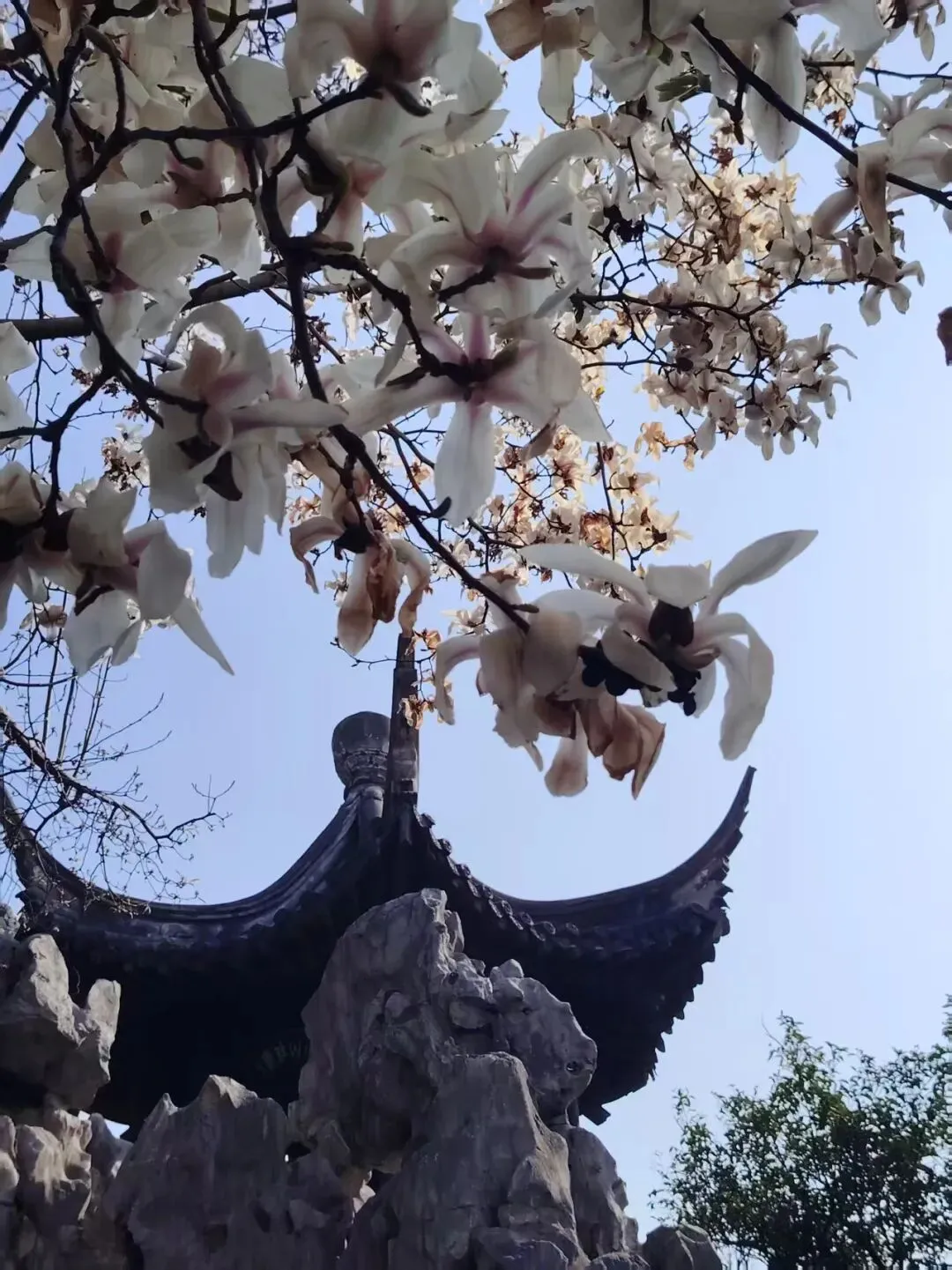 “不入园林,怎知春色如许?” 愚园的玉兰如云似雪,与白墙黛瓦相映成景。花枝斜探,恍若古人悬笔未落的水墨丹青,花香与古韵交织,每一寸素雅都承载着古典园林的独特记忆。
