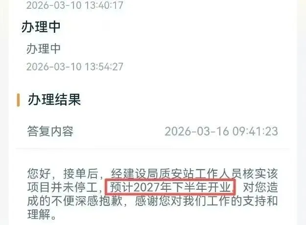 官方给出了最新回复:经建设局质安站工作人员核实,该项目并未停工,预计2027年下半年开业。