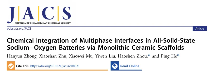 该成果以 “Chemical Integration of Multiphase Interfaces in All-Solid-State Sodium−Oxygen Batteries via Monolithic Ceramic Scaffolds” 为题发表在 “Journal of the American Chemical Society” 期刊,第一作者是 Zhong Hanyun。